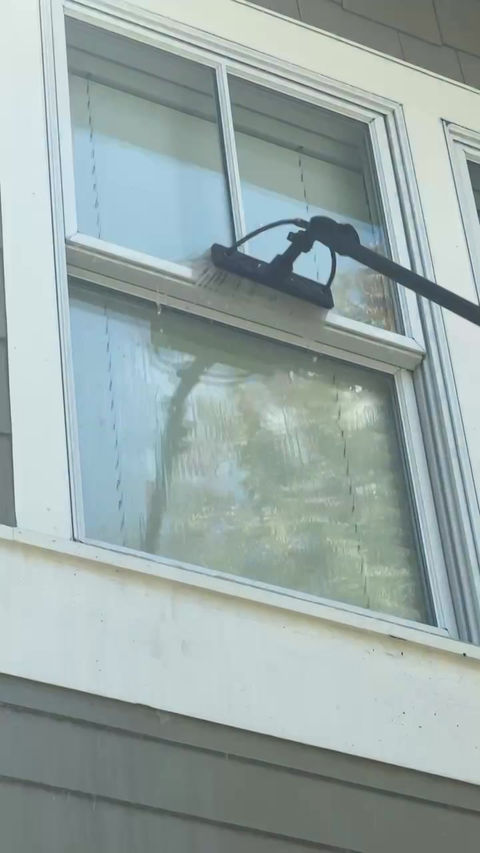 We start by scrubbing the frames, sills, and glass using a 30-foot water-fed pole with a soft-bristled brush, targeting every corner to remove dirt and pollutants effectively without damaging the surfaces.